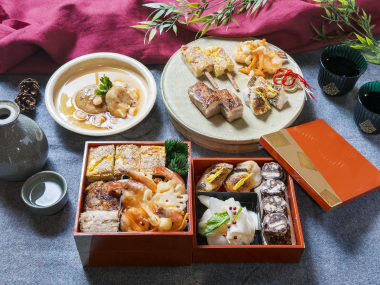 ○のし鶏山椒 ○紅白エスカベッシュ ○黄金松風焼き ○蓮根もち海老あんかけ ○イカと蕪のマリネ ○チョコレートナッツサラミ |