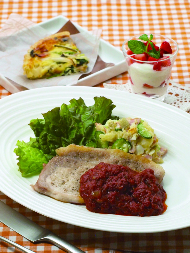 ポークソテー トマトソース掛け ポテトサラダ ほうれん草ときのこのキッシュ フルーツヨーグルト |